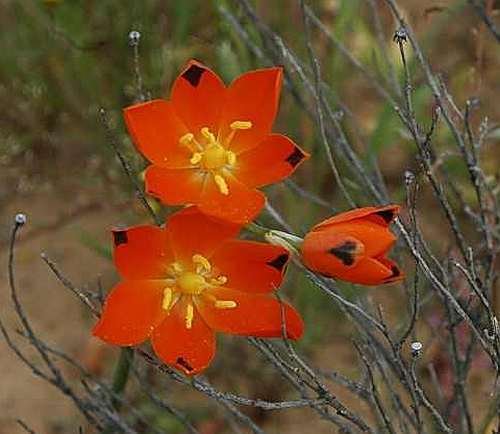 ?Ornithogalum maculatum is native to South Africa. It is a very striking plant with orange to orange-red flowers with the outer tipal tips often having a dark blotch.