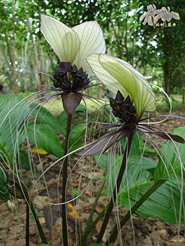 ?Tacca integrifolia, the white bat flower is an upright growing shrub from southeast Asia, which grows up to 1.2 m and is suitable as a room, balcony and patio plant. The dark red flowers of Tacca integrifolia with thread-like spurs look spectacular. The shiny green leaves are spectacular. The shiny green leaves are 60 cm long.