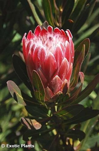 ?Protea obtusifolia, called limestone protea is a 2 - 4m tall shrub with dark-green leaves. Large white/red flowers. USDA zone 8.