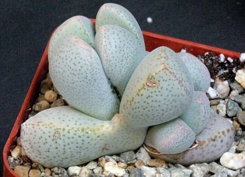 ?Dinteranthus puberulus, a very rare living stone succulent native to South Africa. They have white or yellow flowers in autumn. After they bloom, a new pair of leaves develop, using the moisture from the older pair of leaves to grow.