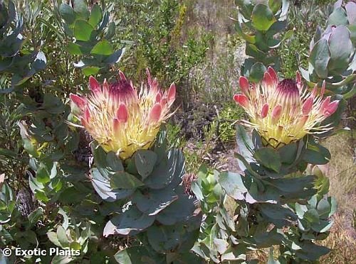 ?Protea eximia, called broadleaf sugarbush is a 5m tall erect to sprawling shrub. Large flowers with long spatulate inner bracts that are widely splayed. Frost tolerant. USDA zone 8.