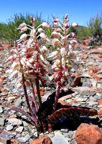 ?Lachenalia zebrina is a striking species, native to South Africa. Lachenalia zebrina develops one ovate pale arching green leaf that is banded with purple and creamy flowers fading to red on long pedicels.