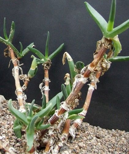 Mitrophyllum clivorum, a slender-stemmed succulent native to Namibia, growing up to 60 cm tall. Yellow-white flowers appear in early summer.