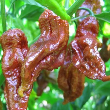 Chocolate Bhut Jolokia Chili is a very rare and extremely hot Heirloom Pepper. The Scoville heat rating is more than 1 000 000 SHU. Be careful with this pepper, it can burn severe your eyes and can cause intense pain.