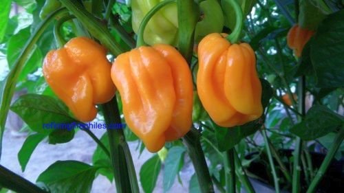 ?Chile Roatan Pumpkin habanero comes from Roatan Island off the coast of Honduras. Pods are wrinkled and ribbed and have a pumpkin look to them. They have a nice orange color and get rather large. The plants are heavy producers so staking plant may be necessary. This chile has above average habanero heat with nice fruity taste. Pods mature from light green to dark orange.