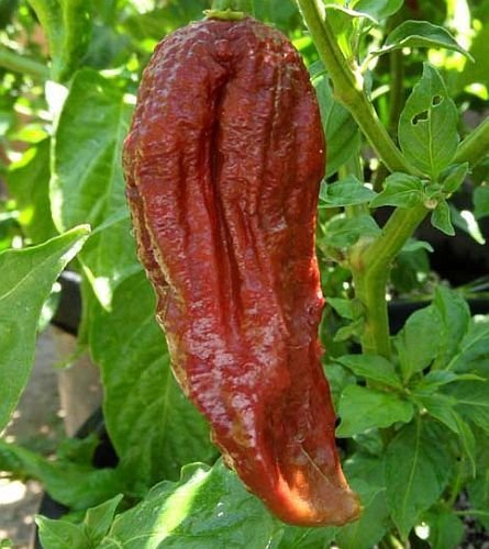 ?Chile Black Naga, the origin is Bangladesh like other Nagas. It grows huge dark brown pods that dwarf the Chocolate Bhut Jolokia. This is the Chocolate version of the King Naga. It also is a very productive plant. Nice sweet heat flavor just like other chocolate chinense varieties. Average heat between 700,000-800,000 Scoville units.