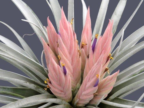 Tillandsia carlsoniae is one of the most beautiful Tillandsias. The leaves are small and long, blueish and white powdered. The flowers are rose to purple colored and very long lasting. Tillandsias will only flower once in its lifetime, but you should have blooms each year as the pups mature, and in turn flower. Flowers can last from several days to many months, depending on the species, most Tillandsia bloom naturally in late winter through mid-summer. Tillandsias are not toxic to animals, although this does not mean your pet won't eat them, but they will survive the experience, your plant might not. Tillandsias are not parasitic, they do not harm the host tree. Trim away brown, bent or damaged leaves, this will not hurt the plant. Main reasons Tillandsias die: They were not initially cared for properly (their owner was told they need little or no water).They did not get enough light (they were more than 10 feet from a bright window or skylight). They were placed in direct sun. Garden windows are generally too warm unless they are shaded or facing north. They were not watered thoroughly and frequently. Bulby and fleshy Tillandsias can rot! Drain them thoroughly and water less frequently. Tillandsias growing outdoors need more watering than indoor Tillandsias, as the sun and wind dry them out more quickly.