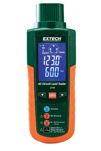 AC Load Tester, Selectable loads of 12, 15 and 20 Amps;Displays Peak Line Voltage and Frequency, Outlet Tester functions, Neutral to Ground Voltage;Measures loaded and unloaded AC Line Voltage;Hot, Neutral and Ground Impedance.;GFCI Trip Time, GFCI Trip Current, Open or Reversed wiring.Complete with AC test cord
