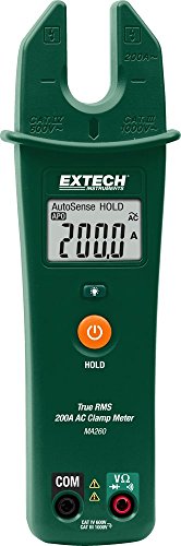 Slim housing construction with built-in test lead holders. The MA260 is a True RMS 200A AC Open Jaw Clamp Meter. The MA260 has a built in NCV detector and can measure up to 200A in its 0.6 in. open jaw. True RMS for accurate readings of noisy, distorted or non-sinusoidal waveforms. Complete with test leads and two AAA batteries. UL listed with a CAT IV 600V safety rating.