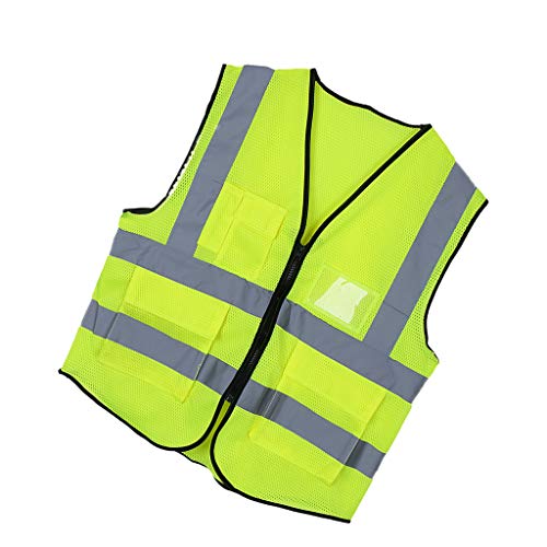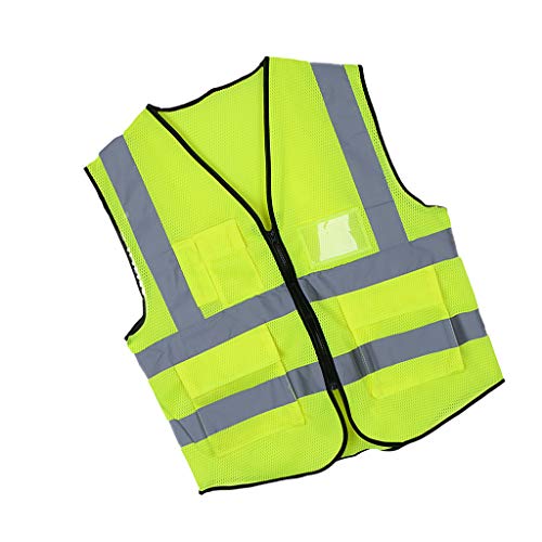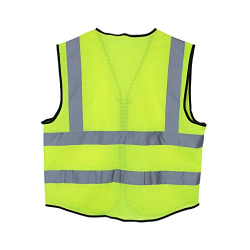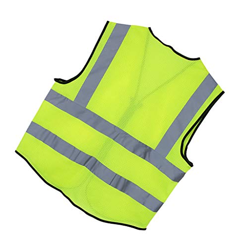 - 彼の安全ベストは軽量で安全性を保つために高い視認性を備えています。