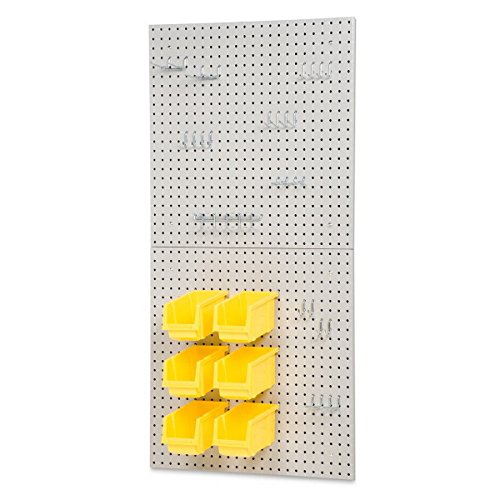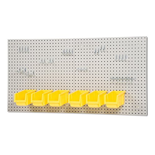 こちらはブランドの新しい24 " X 48 "スチールPEGボードキットツールストレージ23ペグボードフックパネル6ビンを入れることができます。2つの24インチの正方形耐久性の高いパウダーコーティングされたスチールペグボード, 23各種フック用の1つを含む6ドライバープラスチックイエロービンとウォールマウントハードウェアをあしらっています。