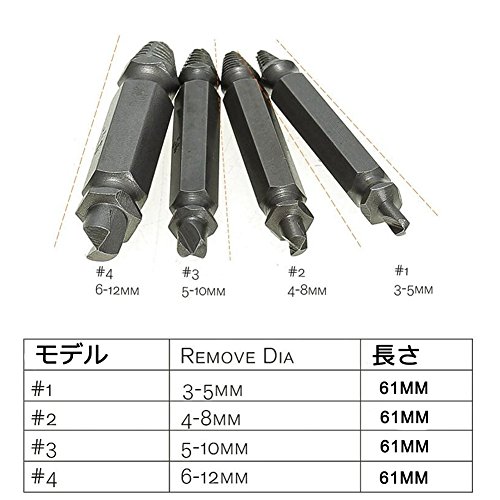 - 使い方:①折れたボルト、またはつぶれたネジ山の中心にドリル等で規定寸法の穴を開けます。。②ネジ頭の穴へに先端を入れ、電気ドリルを反時計回りの回転にして押し込むようにして回転させます(電動工具にも取り付けて使用できます)