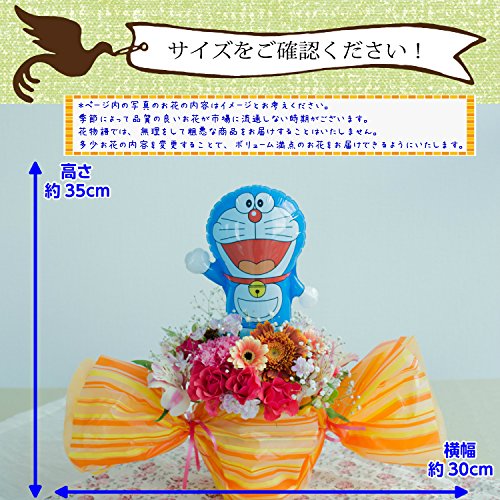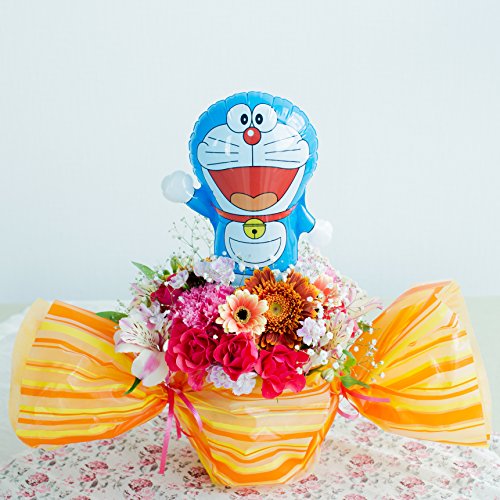 可愛らしいキャンディーラッピングと豪華な生花にドラえもんのバルーンが付いており華やかな仕上がりです。