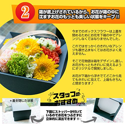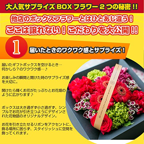 お任せフラワーBOXです。デザイナーがお花の一番美しいフォルムを丁寧に制作致します。箱を開発し、綺麗で美しいアレンジに上下にストッパーが付きお花をつぶさずにお届け致します。ワクワクドキドキの開ける瞬間のサプライズはプレゼントにピッタリです。大臣賞受賞デザイナーが制作する安心感で他店のアレンジとはひとあじ違った美しさをお楽しみください。高さ/約14cm 横幅/約21cm※季節により、品質の良いお花が異なります。多少お花の内容を変更しボリューム満点のお花をお届けします。 ※お花に見合うようにそれぞれラッピングさせていただきます。 ※簡単なメッセージはご記入いただければ作成いたします。
