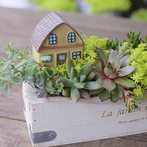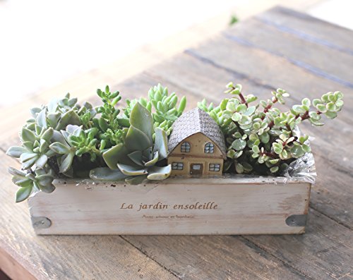木製のシャビーな器にレトロな文字が刻まれていて多肉植物の中に可愛いお家が加わりとってもキュートなデザインです!