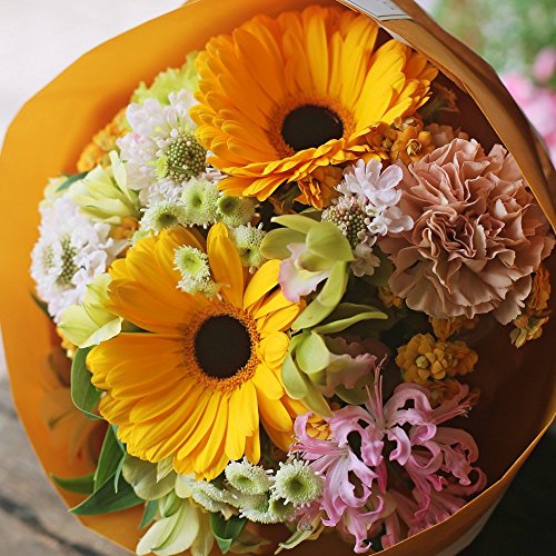 【 クール便 】 花束 生花 ギフト Lサイズ ( イエロー オレンジ 系 ) 大臣賞受賞 デザイナー お任せ花束