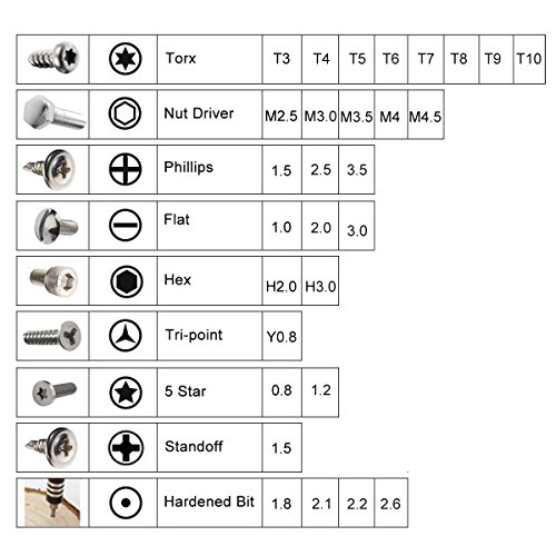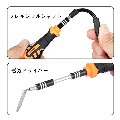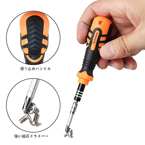 - [33in1の多種類]滑り止めハンドル、フレキシブルシャフト、延長ロッド、精密ピンセット付き。ビット種類:プラス、マイナス、星型六星トルクス、五角形星型、Y型、三角形、SP2.0など。ビットを差し替えて使うので、ドライバーを何本も持たなくても済むというのが一番です。電動ドライバーにも使えます。