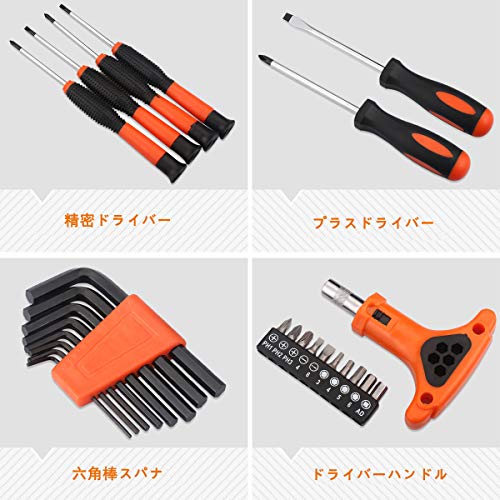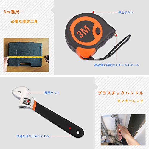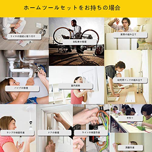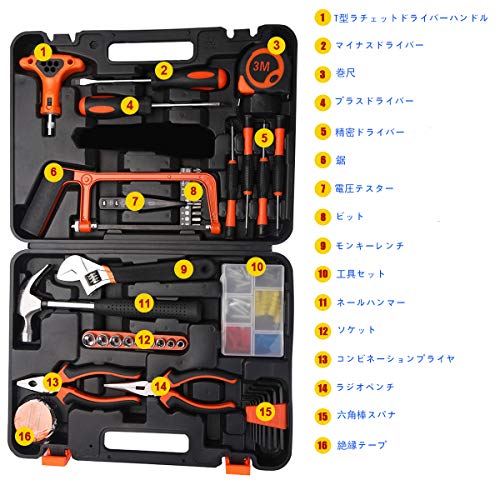 - 「82点の家庭の日常工具セット」ドライバー、巻尺、ラジオペンチ、六角棒スパナ、絶縁テープ、コンビネーションプライヤ、ネールハンマー 、電圧テスター、鋸、ビットセット、工具セット、モンキーレンチ、ソケットなど。家庭工具として、一本あると便利です。