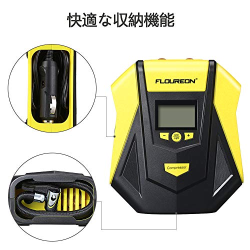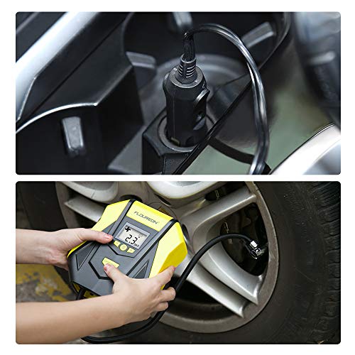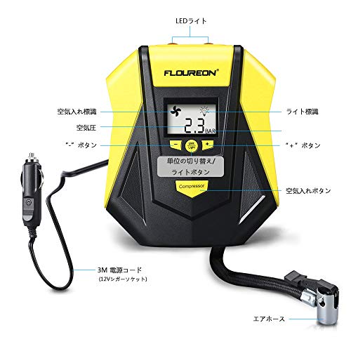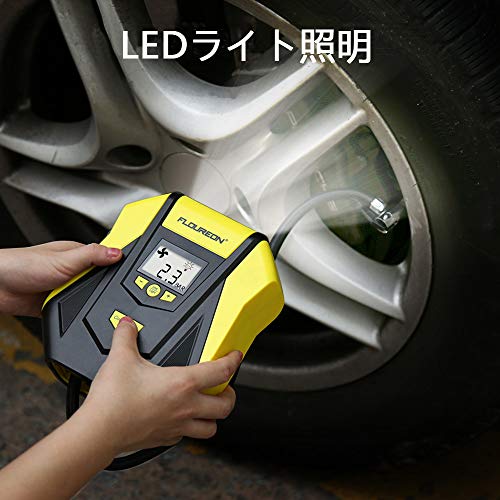 FLOUREON エアコンプレッサー 車用空気入れ 空気圧測定 DC12V シガーソケット接続 ノズル付き デジタル表示 LEDライト 自動車 バイク 自転車 ボール 浮き輪【一年間保証付き】
