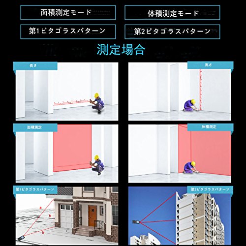 - 【測定モード】単一距離測定、連続測定(最大・最小の距離)、面積・体積・ピタゴラス(辺測定)を測定し、測定値の加算・減算可能です。