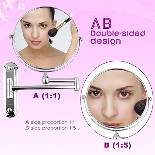 8インチ アームミラー 壁付けミラー 5倍 拡大鏡 折りたたみ可能 360度回転可能 洗面所に取り付け 両面鏡 シルバー