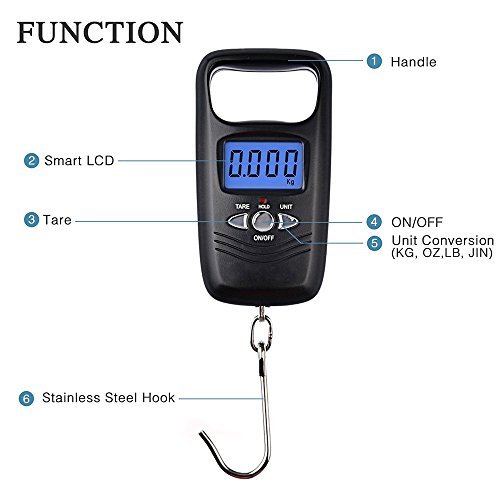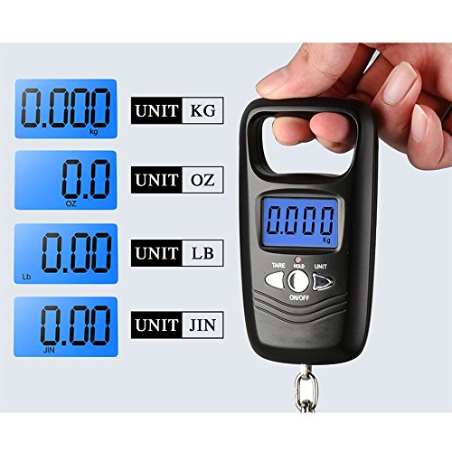- デジタル式の釣り下げ秤、頑丈で使用も簡単:50kgまでの製品は吊った状態で2秒後にビープ音がし重量の数値があります。精度は、0〜10kgまでは誤差5g 、10〜50kgは誤差10gの精度です