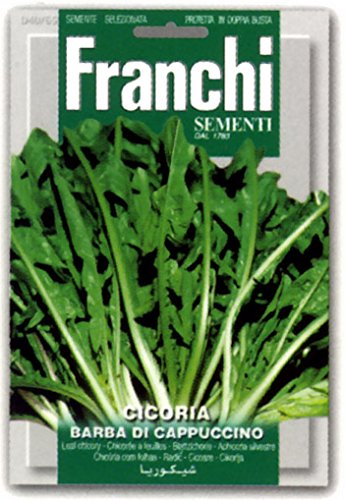 【種まき】日当たり、水はけが良く有機質に富んだ肥沃な土をしっかり湿らせ、スジ蒔きをして覆土は1cm位とします。発芽までの1~2週間は表面を乾燥させないように管理します。 【栽培】本葉2-3枚で株間25-30cmに間引きます。この際たっぷりと有機肥料(フランス・コフナ等)を与えます。チコリーは直根性のため、一般的に移植を嫌います。【特徴】中早生種、比較的栽培が簡単なチコリーです。細長い茎は上方に行くほど白色から緑色になります。ギザギザでノコギリのような濃い緑色の葉を付けます。この品種の名前となっているカプチーニ氏は宣教師のくせに酔っ払いで有名でした。”BARBA DI CAPPUCCINO”とはカプチーニ修道士のあご髭という意味です。マイルドな苦味があります。若葉をサラダなどの生食用に、また成熟した葉茎は加熱調理します。シャキシャキとした食感が好まれます。