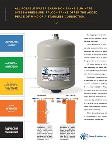 ファルコンステンレスE.T. 飲料水膨張タンクは、逆流防止装置または逆止弁を使用する家庭用水システムにおいて安全な圧力を維持するように設計されています。E.Tタンクには、100%のブチルダイヤフラムとプラスチック製のライナーがあり、システムの水とタンクの空気プリチャージを分離します。システム接続には、腐食を防ぐためのステンレススチール製のスリーブが付いています。そして、タンクは、外部の腐食を防ぐのに役立つ塗装品質の塗料で仕上げられています。--