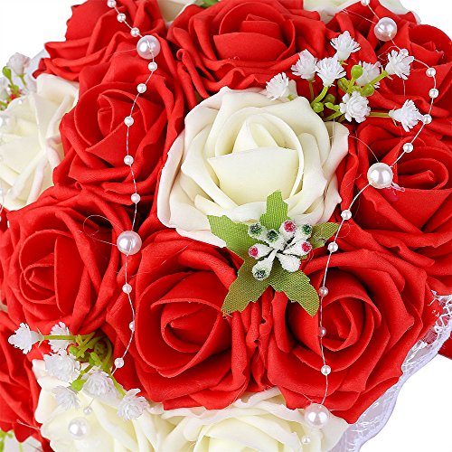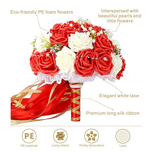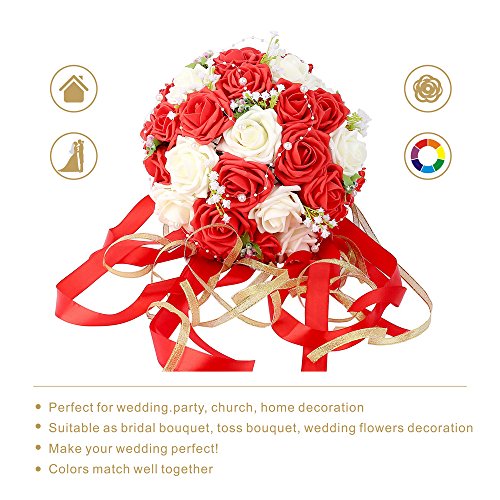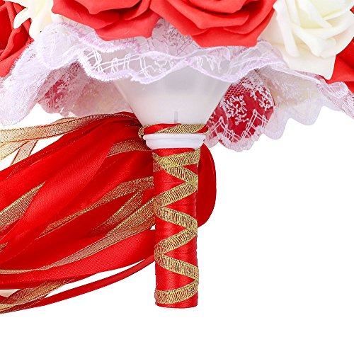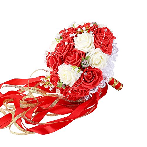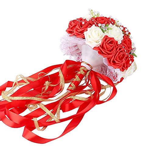 ウェディングブーケ、febou Holdingブライズメイドブーケ、ウェディングブライダルブーケ人工バラレースパールリボン、ウェディング、、教会、パーティー、ホームデコレーション Long Ribbon