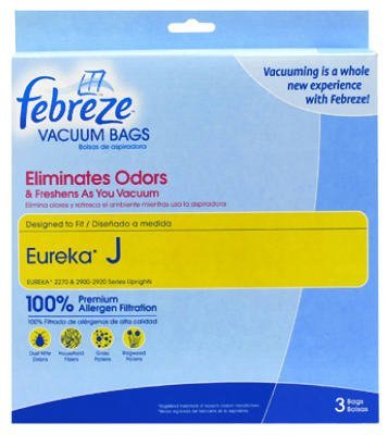 "HOME CARE INDUSTRIES INC" VACUUM BAG : Febreze.100% Premium Allergen Vacuum Cleaner Bag.Designed To Fit Eureka J.Eliminates Odours & Freshens As You Vacuum.Unique Odour Eliminator Neutralises Stale Household Odours As They Form.The Febreze Freshness Strip Lets You Experience The Febreze Freshness As You Vacuum.To Activate Simply Peel & Remove The Top Cover Of On The Febreze Freshness Strip Before You Place The Bag In Your Vacuum.Captures 100% Of Dust Mite Debris, Household Fibres, Grass & Ragweed Pollens, Plus Dust, Pet Dander & Mould Spores As Small As 0.1 Micron.