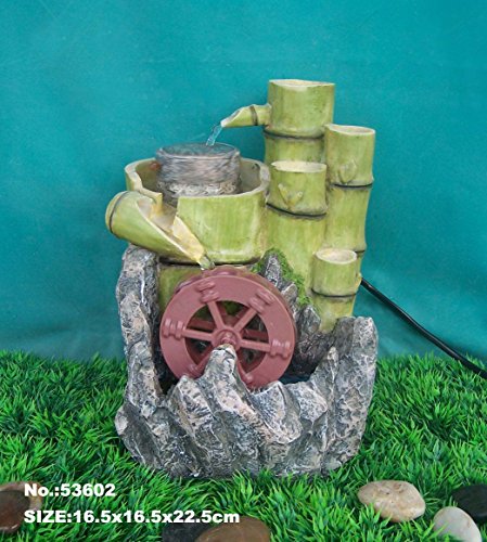 Water comes from the top of the bamboo pile and grinder, then goes down to the wheel to make the wheel running. . The water fountain is made of resin. The dimension of it is approx. 6 1/2" x 6 1/2" x 9". See more Water Fountains