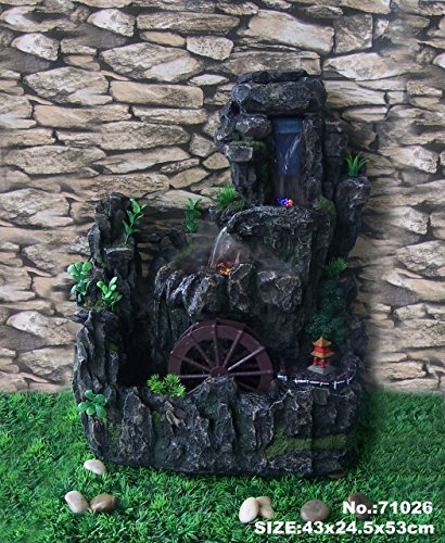 This fountain is big fountain and it can be used as garden fountain or yard fountain. Water comes down from the top of the fountain along the wall to the second level, then goes down to make the wheel running. The water fountain is made of resin. The dimension of it is approx. 17 1/4" x 9 3/4" x 21 1/4". See more Water Fountains