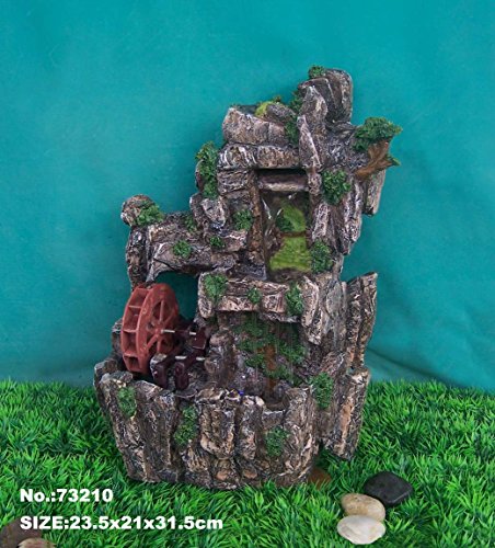 Water falls down from the high mountain and goes to the second level. Then falls down like the real water fall. In addition, water from another part of the water fountain falls down and make the wheel running. Once the wheel runs, it also makes two hammers up and down to hit the grinds. The water fountain is made of resin. The dimension of it is approx. 9 1/2" x 8 1/2" x 12 1/2". See more Water Fountains