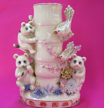 This vase is made of high quality porcelain which is called "Gu Chi". This kind of porcelain vase (Gu Chi) has yellow color whatever inside or outside of this vase. It is decorated with lovely pandas and birds. The Chinese characters on it mean Beautiful Garden. There is one small bulb inside the vase. It is used as decoration vase. This is one hole in the bottom and electric lamp inside. approx. 11" in height. See more Vases, Jars, Pots
