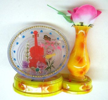 This beautiful music gift consists of 2 parts: pretty vase with artificial Ninon flower and small red violin inside the clear round shape condom. There are also some lights decorated inside around violin. When turned on the button, you can see lights flashing and hear music. two AA batteries not included made of plastic approx. 6.5" x 6.5" x 3" See more Chinese Gifts .