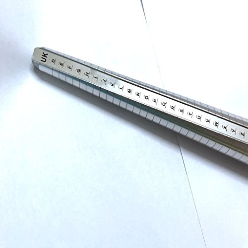 - 溝付きリングゲージスティックを使用すると、ジュエラーにとって不可欠なツールであるD~Z + 5(英国サイズ)のリングを正確に測定することができます。