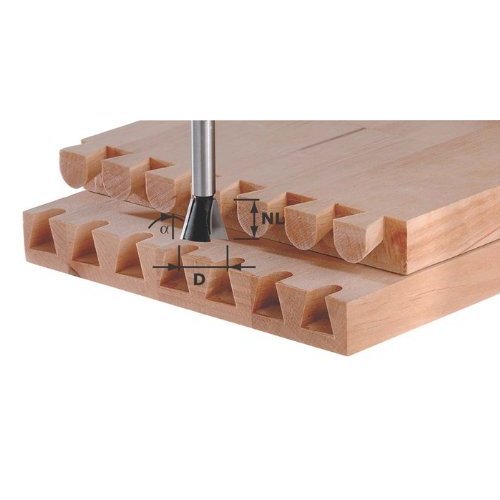 Measures 8 mm shank diameter and 20 mm cutting diameter. This Festool Dovetail Router Bit has an 8 mm shank size. This provides 58 percent more volume than a 1/4" shank router bit. The greater diameter reduces vibration and is more resistant to bending or breaking. Plus the larger shank allows you to use a larger diameter bit with your router. HW cutters (formerly HM cutters) also withstand tremendous loads when cutting hardwood, laminated materials and plastics. Quality begins with the selection of high-quality raw materials. Festool uses top quality steel and extremely wear-resistant tungsten carbide for its cutters. Induction brazing ensures durable solder joints and a long service life. Festool router bits are high-quality, state-of-the-art products developed for practical applications. They are tested, monitored, and checked under the most rigorous conditions. This Router Bit is for use with VS 600 SZ 20, 488878. L=46, D=20, NL=17, Angle=15 degrees