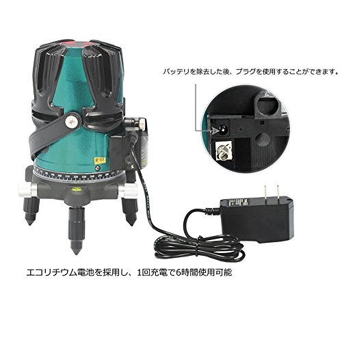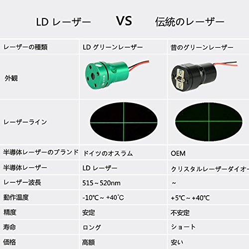 商品の説明:br・光源:520 nm グリーン半導体レーザー(地墨:650nm)br ・レーザーレベル:2級 br ・水平・縦ライン精度:±1mm/10m br ・自動補正範囲:約±3°br ・作業範囲:屋内モード約10m / 屋外モード約25m(受光器使用時)br ・傾斜アラーム:約±3°で消灯、アラーム音br ・電池寿命(全点灯時):連続約5時間 br ・動作温度範囲:-10℃~+40℃ br