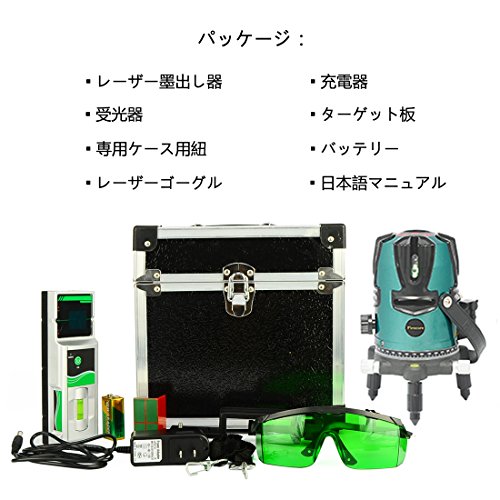 - 【パッケージ内容 】Firecore8ライン レーザー墨出し器本体、受光器、専用ケース、レーザーゴーグル、充電器、L型ターゲット板、バッテリー、日本語マニュアル。