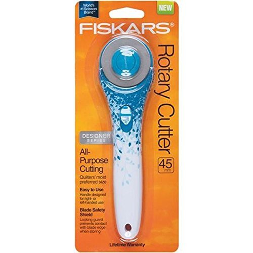 Fiskars-Blue Floral Designer Stick Rotary Cutter. Cuts through materials including multiple layers of fabric paper felt and vinyl. Our highest-grade precision ground stainless steel blades stay sharper longer. Includes a safer storage-sliding button retracts blade guard for use. Works for right or left handed use. This package contains one 45mm rotary cutter. Imported.