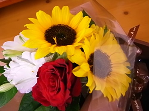 - 幅:約18cm 高さ:約20cm ヒマワリ3本・その他4本以上 入荷により花材は変更いたします(写真は一例です)
