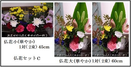 仏花セットC 【生花】【お墓参りの花・ご仏壇の花】 【お盆・お彼岸・ご法要・ご命日】 仏花大 1対( 2束) +仏花小1対( 2束) お届けのご希望日時は注文日から 4~25営業日で必ずご指定ください。 (仏花セット C)