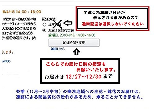 - 【重要】お届けのご希望日時は必ずご指定ください。(Amazonのシステム上、お届け予定日と異なる日にちが画面上やAmazonからのメール内に表示される場合があります。)amazonのシステム上ご注文内容の変更は出来ません。ご注文内容変更をご希望の場合は、1度キャンセルをし、新たにご注文をお願いいたします。(ご変更・キャンセルは、発送日の5日前まで) 生花をギフトとしてお贈りする場合、ご都合の良い日程をご確認いただくか、事前にお届けのご連絡をお願いいたします。ご不在のため、お届けができない場合も返品・交換を承ることはできません。また生花のため返金もいたしかねますので、予めご了承ください。ご注文情報についてamazonのシステム上お客様がご注文いただきましてから当店にご注文情報が届くまで最大5時間程度かかる場合がございます。お急ぎのご用件は直接当店【mum56@e-mail.jp】にご連絡いただきますようお願いいたします。(火曜定休日)