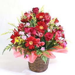 メインに赤系の花材を使用してアレンジに仕上げます。御祝いなどに最適です。