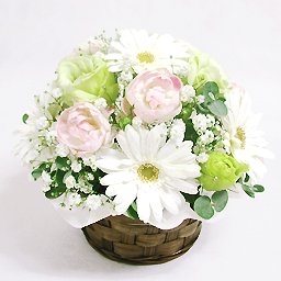 白をメインに淡い色の季節の花をかわいいラウンドアレンジにします。