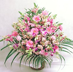 ピンク色の季節の花を取り合わせて大きなアレンジに仕上げます。開店お祝いなどに。