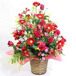 赤い色の季節の花を取り合わせて大きなアレンジに仕上げます。開店お祝いなどに。