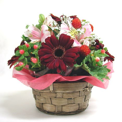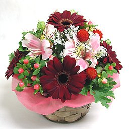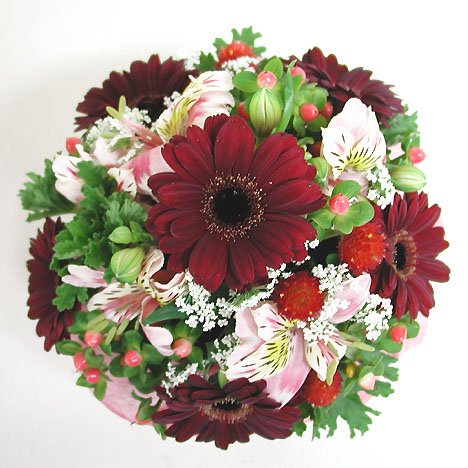 赤色の季節の花をかわいいラウンドアレンジにします。
