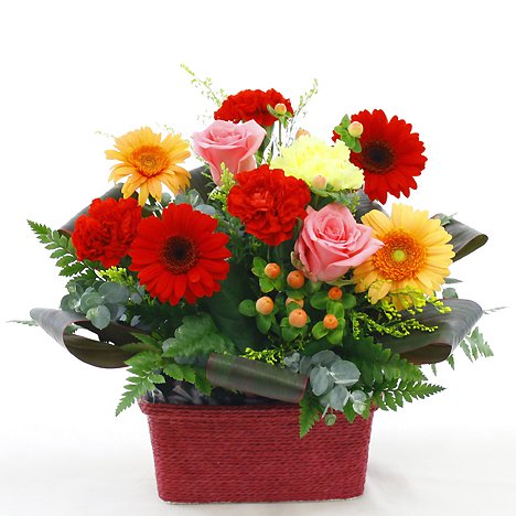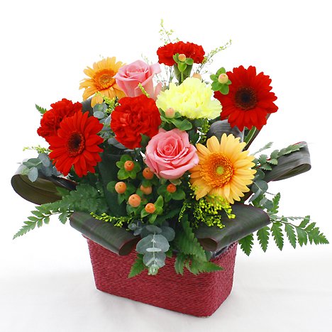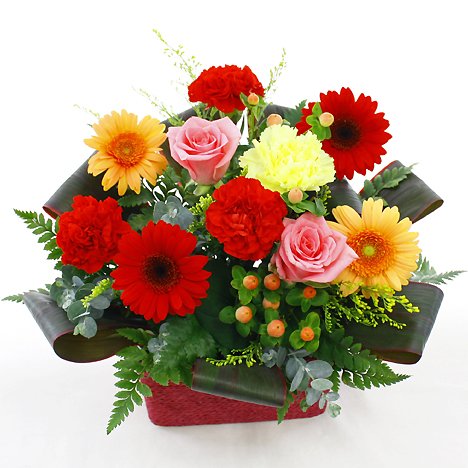 - 【花材】 ガーベラ、バラ、カーネーション、ヒペリカム、グリーン等