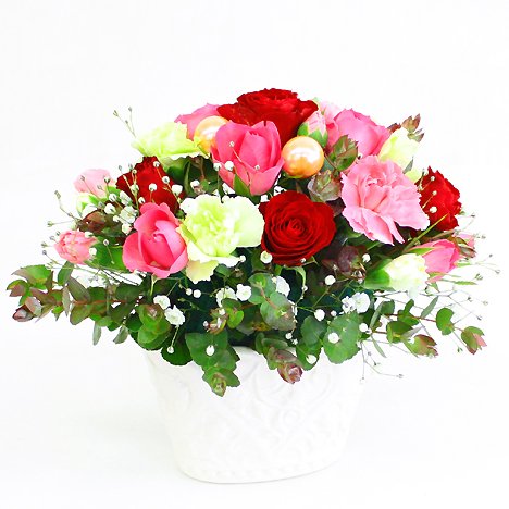 ピンクと赤色のスプレーバラをメインにしたアレンジメントです。